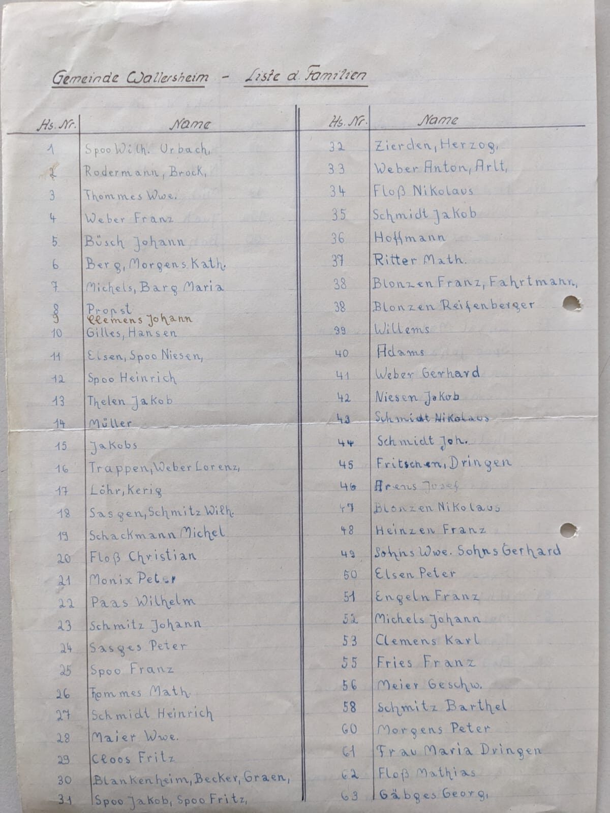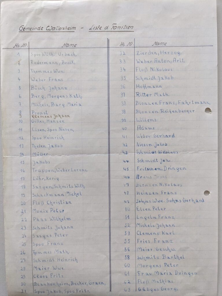 Die Liste der "Familien" wurde von xyz im Jahre abc erstellt. Sie beschreibt die Häuser, die beim Anschluss Wallersheims an das kommunale Wasserleitungsnetz an die Versorgung angebunden wurden. Vorher verfügte Wallersheim über eine gemeindeeigene Wasserversorgung. (Durch einen Click auf die Karte, wird diese vergrößert)